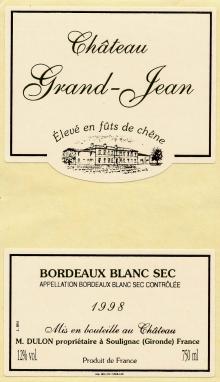 Dans cette famille, on est viticulteur de père en fils depuis plus de 150 ans et on fait du vin au Château Grand-Jean depuis 1750. Composé de 12 hectares à l ‘époque du fondateur Jean, la propriété aujourd’hui dirigée par Michel Dulon compte 80 hectares en Bordeaux et dans la meilleure partie de l’Entre-Deux-Mers, le Haut-Benauge. Fort d’un savoir-faire de 9 générations, cette Famille s’attache à produire des vins de grande qualité avec des techniques modernes et un élevage traditionnel digne des AOC Bordeaux et Entre-Deux-Mers. Le vignoble, qui a 30 ans d’âge moyen, produit environ 4500 hectolitres par an et se décompose pour moitié de cépages rouges avec 70% Cabernet Sauvignon, 5% Cabernet Franc, 25% Merlot et de cépages blancs avec 80% Sémillon, 10% Sauvignon et 10% Muscadelle. L’exposition privilégiée des coteaux de Soulignac et les terrains argilo-calcaires assurent à la vigne des conditions idéales à l’élaboration d’un grand vin et donnent ce goût de terroir spécifique au Château Grand-Jean. La vinification des vins rouges vise à extraire les matières colorantes et les tanins contenus dans la peau du raisin, notamment lors de la macération en cuves. Celle-ci achevée, en collaboration avec l’œnologue un assemblage est effectué à partir de ses propres cuves, compte tenu que les cuves sont séparées pour chaque cépage. L’assemblage tire profit des qualités propres de chaque cépage pour donner au vin final caractère, équilibre et harmonie. Les vins font ensuite l’objet de nombreux soins dans le chai : soutirages, clarifications, filtrations. L’élevage en cuves ou en barriques est destiné à faire mûrir les arômes et à élaborer des vins qui concilient finesse et aptitude au vieillissement. Le vin mis en bouteille au Château connaîtra au fil des années une lente évolution.