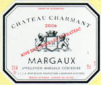Château Charmant : exploité depuis le début du XIXième siècle par trois générations de la famille Renon, le domaine s’étend sur 4 hectares69 entre les communes de Margaux et de Soussans sur des sols de graves et savlo-graveux situé sur des croupes exposées sud, sud-ouest de la prestigieuse appellation Margaux. Le vignoble est entouré des grands crus (Château Margaux, Lascombes, Cantenac, Brown ) possède des ceps de vignes centenaires, l’âge moyen de 55 à 60 ans est composé de 50% Merlot, 30% Cabernet Sauvignon 15% Cabernet Franc et 5% petit Verdot. Le Château Charmant produit des vins dotés de belles couleurs vives et soutenues, un nez bouqueté avec une touche boisée, vanillée, en bouche un corps rond, ample, avec de bons tanins. Un bel équilibre entre souplesse et puissance.