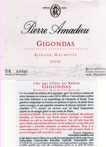 La Maison familiale a été fondée en 1929 à Gigondas par le grand père,et la Maison Pierre Amadieu est installée en plein coeur de la Provence dans le département du Vaucluse.Les vins issus de la propriété, actuellement 140 Hectares, sont élaborés, élevés et mis en bouteilles par nos soins sur différents sites, propriétés de la famille Amadieu. La Famille Amadieu est propriétaire de plusieurs vignobles dans le Vaucluse : • 6 Hectares de Vignes sont plantés à Peines les Fontaines, en zone d'appellation Côtes du Ventoux et en Vin de Pays de Vaucluse dont les raisins sont vinifiés à Gigondas. • 7 Hectares de vin de table situés sur la commune de Travaillan sont destinés à la vente en vrac dans nos caveaux • 135 Hectares de vignes sont plantés dans l'aire d'appellation Gigondas. Ce Domaine Romane Machotte représente plus de 10% de l'appellation, il s'agit du premier vignoble privé de l'appellation. Situé en coteaux à une altitude d'environ 300 m et d'orientation Ouest sur des sols argilo calcaire, 30% du vignoble est équipé en drainage. Le Domaine Grand Romane : Sélection de 40 hectares du domaine familiale, les vins sont vinifiés dans la bâtisse de " La Romane" puis élevés en fûts de chêne neuf et en foudres dans la cave de "La Machotte", située en plein coeur du vignoble. Les vinifications se déroulent au siège de la propriété à Gigondas, puis les vins sont élevés en foudres de chêne dans un ancien tunnel de chemin de fer situé à Pierrelongue. La mise en bouteille et les expéditions sont effectuées depuis nos bureaux de Gigondas, sont actuellement commercialisées 500 000 bouteilles par an dont 250000 bouteilles de Gigondas.