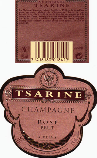 C’est en 1730, sous le règne du roi Louis XV, que les frères Chanoine, Jean-Louis et Jean-Baptiste, établirent leur Maison de Commerce de vins de Champagne sous la raison sociale Chanoine Frères et obtinrent de la ville d’Epernay l’autorisation de creuser la première cave à champagne.C’est en hommage à la Russie des Tsars, principal marché étranger du champagne XIXème siècle, que Chanoine Frères a créé le Champagne Tsarine .« Le pinot noir construit nos vins, le pinot meunier l’arrondit en arômes fruités et le chardonnay leur apporte finesse et élégance. Tel est l’esprit des assemblages Tsarine. »